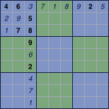 Fill in the 9x9 grid so that the digits 1 - 9 appear only once in each row, column and group (sometimes called box.) To illustrate this we've blanked out most of the puzzle to the left. |